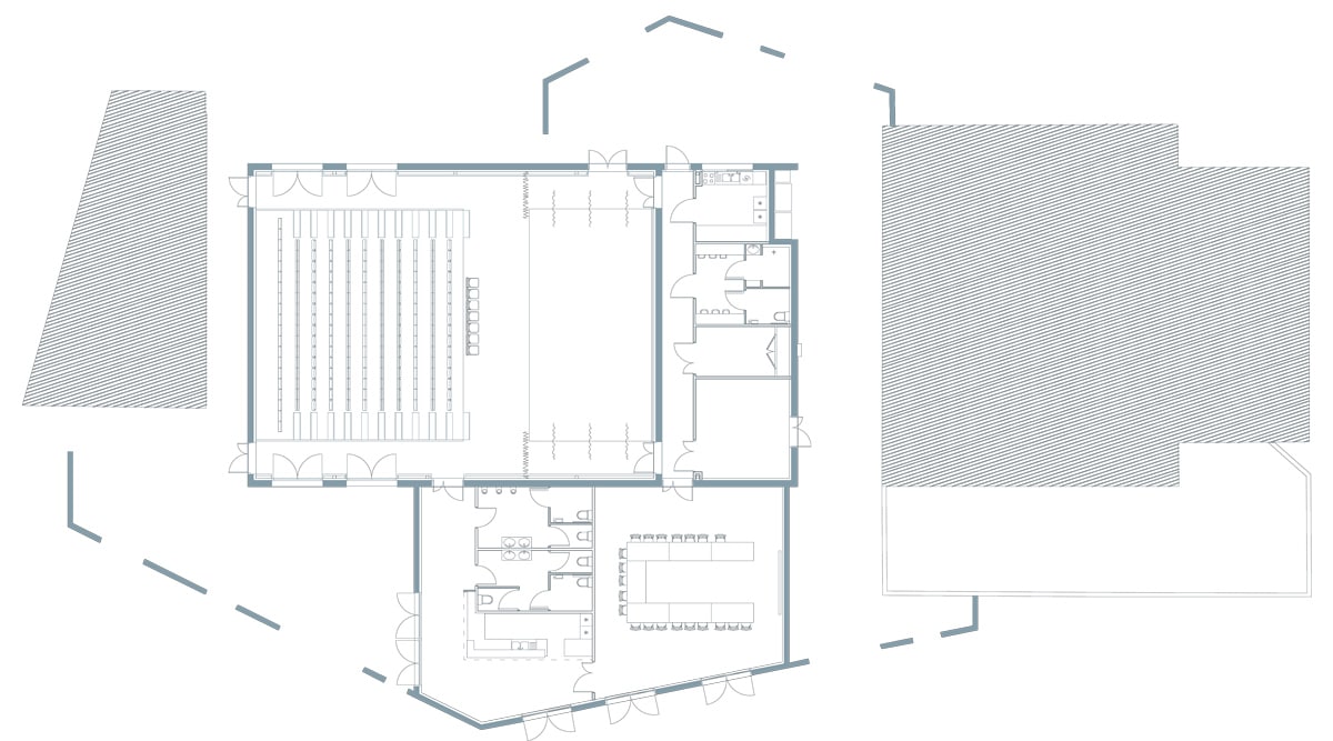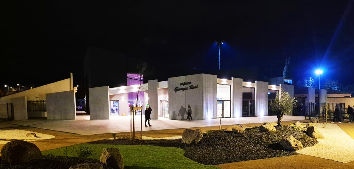 Ce projet de reconstruction de la salle polyvalente s’inscrit dans un ensemble bâti plus global, entre la salle des jeunes et les vestiaires du stade municipal.