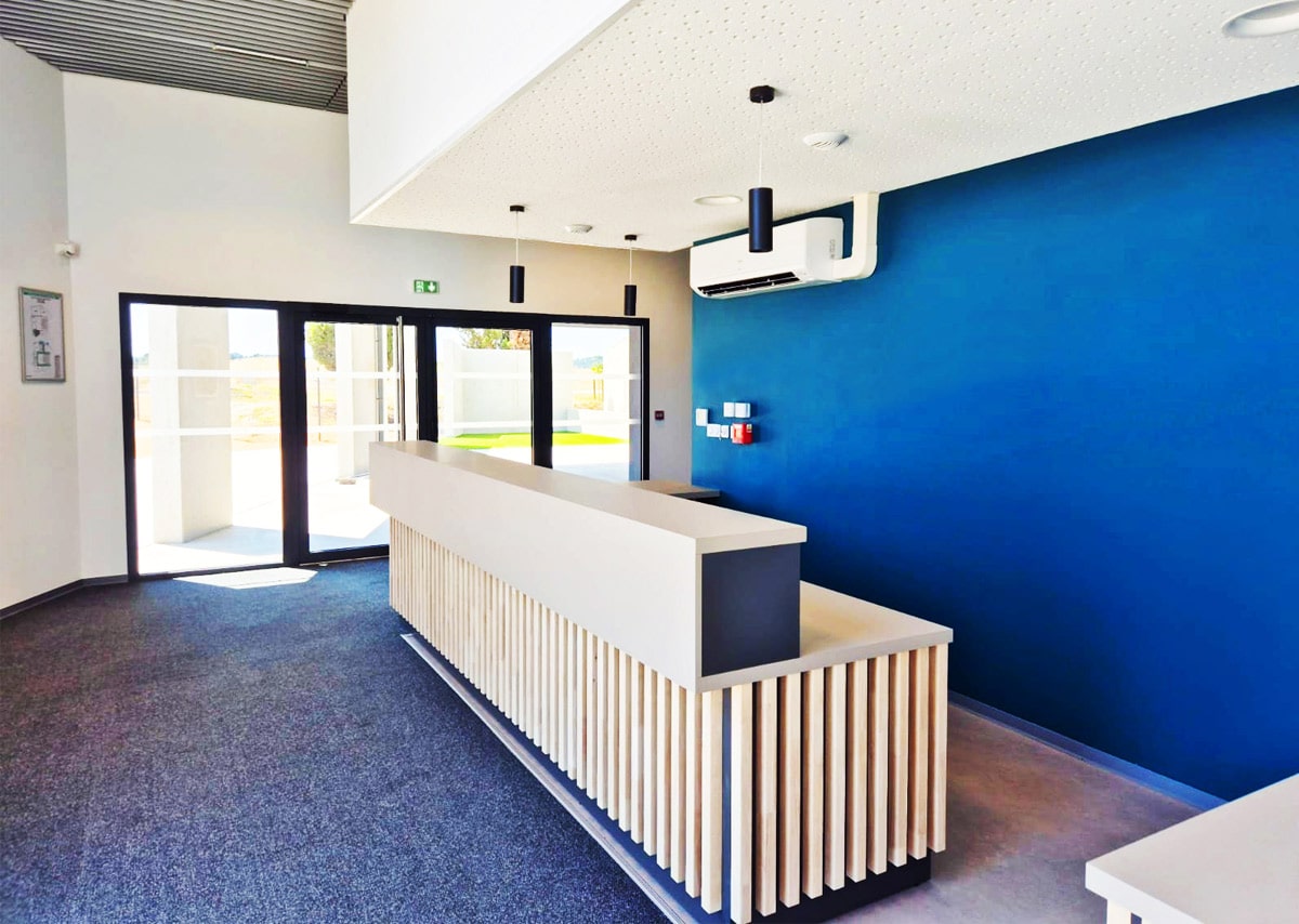 Si la construction reprend les proportions du bâti existant, sa volumétrie et son aspect, plus contemporains, rompent avec les équipements adjacents. Afin d’assurer l’unité architecturale de l’ensemble, une paroi est insérée en premier plan, réalisée en béton matricé et englobant les trois entités.