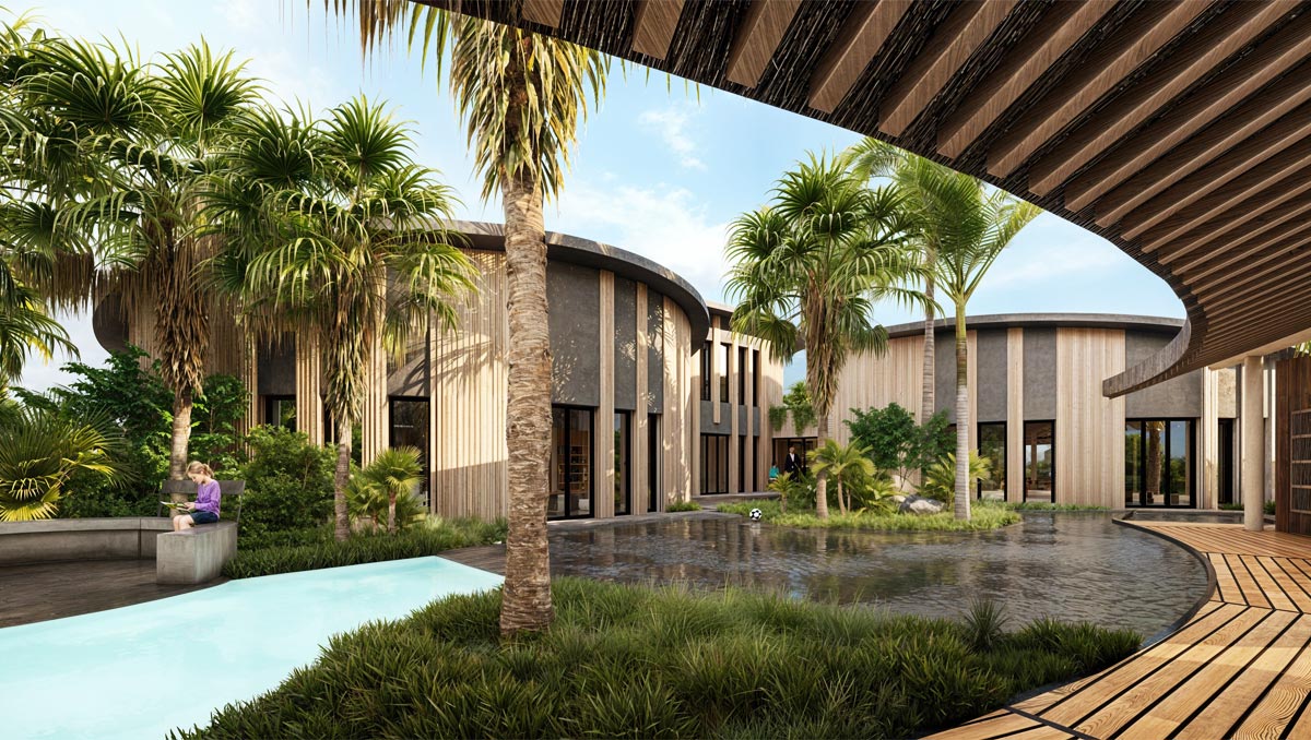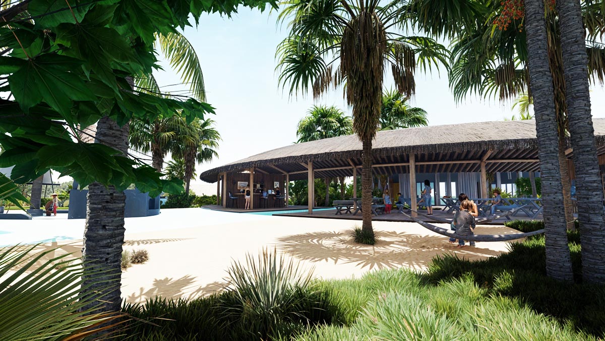 Etablissement d’accueil en semi plein air, le projet est conçu de manière à promouvoir la diversité des activités. Le rez-de-chaussée intègre deux salles d’activités, une salle de restauration (self-service) et un dortoir. L’étage accueille une salle d’art et une salle de spectacles organisée en amphithéâtre. Les cabanes extérieures abritent un atelier-bar, un espace avec des tables et une salle de jeux. Une plage artificielle avec des hamacs, des jeux d’eau et des structures de jeux complètent l’aménagement.