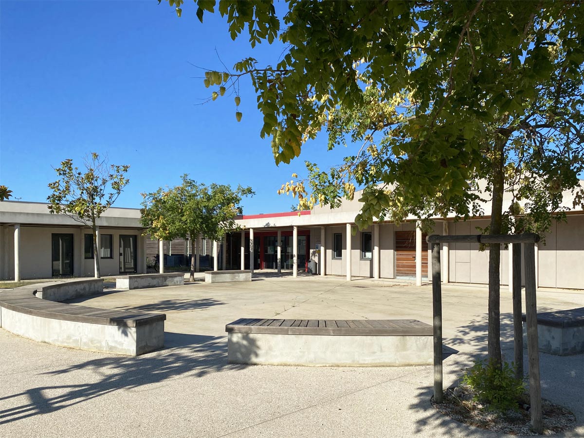 Le programme prévoit la réalisation d’une crèche, d’une maternelle (4 classes) et de l’extension des services de restauration. Il s’inscrit dans la continuité du groupe scolaire existant. Un espace public majeur est créé afin de fédérer l’ensemble des équipements et de valoriser l’entrée Ouest de la commune. Le groupe scolaire s’articule autour de cette “agora”, parvis sécurisé reliant les différents bâtiments scolaires par une coursive.